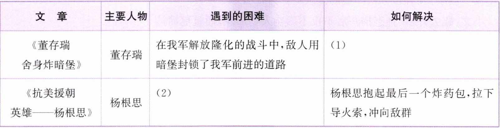 答案:三、1.(1)董存瑞主动请战,冲向敌人的暗堡;他手托炸药包,舍身炸毁敌人的暗堡 (2)敌人向我军扼守的阵地发起进攻,我军弹药不足,全排只剩杨根思和两名伤员 2. 语言 坚决 视死如归、坚定无畏