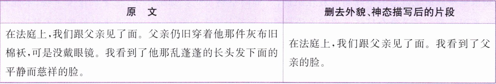 答案:示例:1. 不认同。 对父亲的外貌、神态描写能使父亲的形象更加立体:“没戴眼镜”“乱蓬蓬的长头发”透露出“父亲”经历了残酷的刑罚,“平静而慈祥的脸”刻画了父亲坚贞不屈的意志和对孩子们的爱。如果去掉外貌、神态描写,就达不到这样的效果。