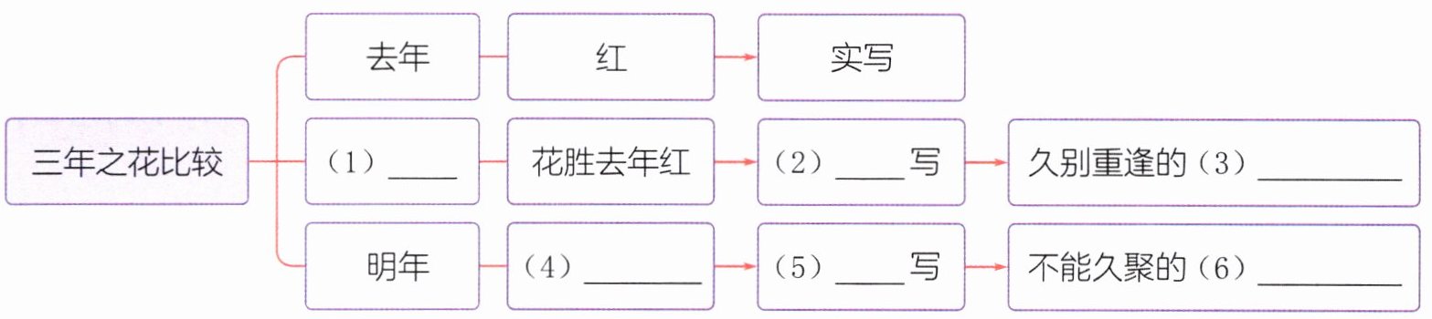 ”。3. (思维导图)理解“今年花胜去年红”和“可惜明年花更好”所表达的含义,完成思维导图。