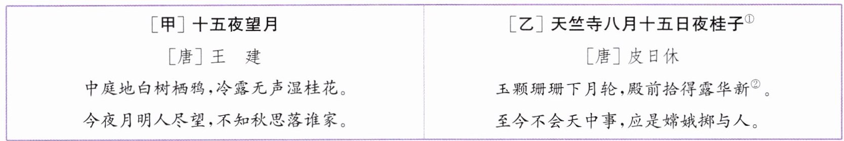 D. 两首诗都以“月”为核心意象,《十五夜望月》借月光营造清冷氛围,《天竺寺八月十五日夜桂子》则通过想象月中桂子飘落的景象,营造出浪漫奇幻的意境。
