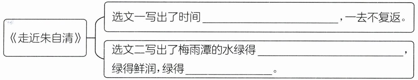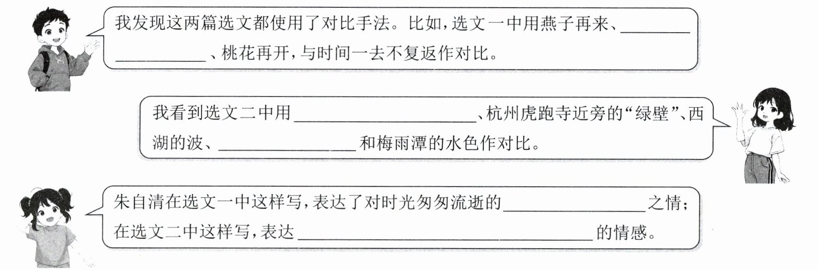 )答案:1. 流逝 奇异 醉人 2. 杨柳再青 北京什刹海拂地的绿杨 秦淮河的波 无奈与惋惜 对梅雨潭的热爱与赞叹 3. “跨”“飞”“溜”“闪”都表示速度快,从“跨”到“闪”,速度越来越快,将无形的时光有形化,形象地写出了时间流逝悄无声息、匆匆的特点,表达了作者对时间流逝的无奈和惋惜。