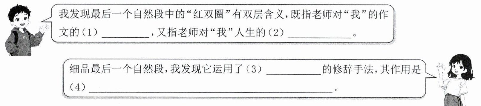 我发现最后一个自然段中的"红双圈"有双层含义,既指老师对"我"的作文的(1)