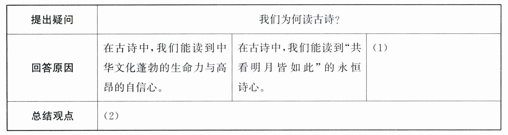 答案:1. (1)在古诗中,我们能读到"斯文万古存"的坚韧力量。 (2)因为在这个时代,我们可以在古诗的吟诵中培育健全的人格,获得无尽的精神力量。