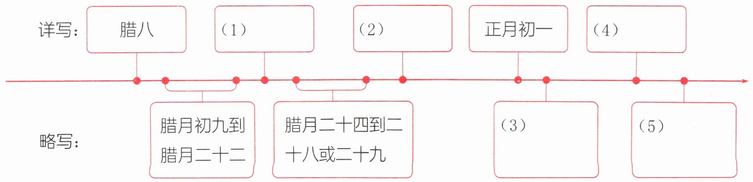 答案:五、 (1) 腊月二十三 (2) 除夕 (3) 正月初六 (4) 元宵节 (5) 正月十九