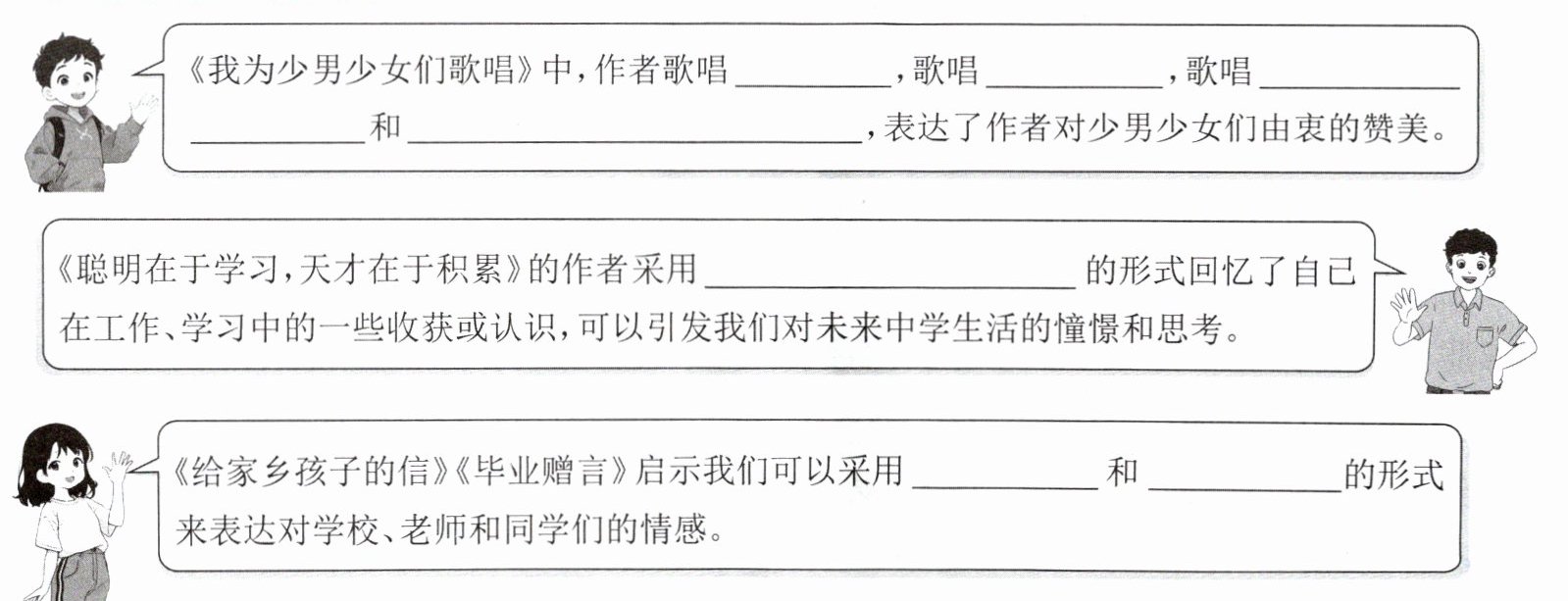 答案:四、1.(1)比喻 这些美好事物传播时的轻柔、自然且能给人带来温暖与希望的特点 (2)示例:秋日的山林,层叠的红叶像燃烧的火焰漫过山岗,金黄的银杏叶如万千蝶翅在枝头轻颤,就连飘落的枯叶也似一封封写满思念的信笺,铺满林间的每一寸土地。 2. 示例:我努力学习不是为了获得旁人的称赞,而是为了掌握更多知识,将来能为社会的发展贡献自己的力量。