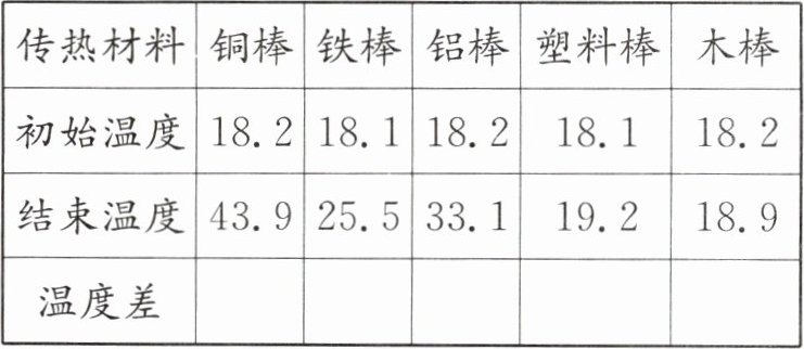 11. 新趋势 学科融合 在研究铜棒、铁棒、铝棒、塑料棒、木棒传热快慢的实验中,科学老师为了使实验效果更明显,数据更科学,课上他用电子温度计代替教材中提到的粘有凡士林的小珠子进行实验,数据记录如下。(单位:℃)