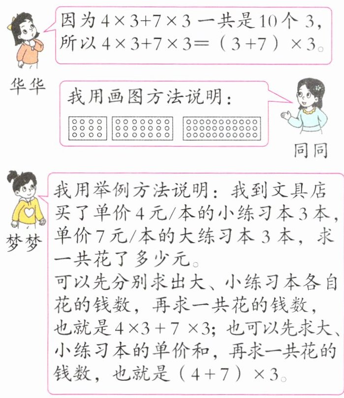 梦梦:我用举例方法说明:我到文具店买了单价 4 元/本的小练习本 3 本,单价 7 元/本的大练习本 3 本,求一共花了多少元。可以先分别求出大、小练习本各自花的钱数,再求一共花的钱数,也就是$4×3 + 7×3$;也可以先求大、小练习本的单价和,再求一共花的钱数,也就是$(4 + 7)×3$。