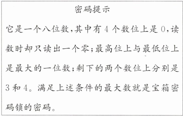 低位上是最大的一位数;剩下的两个数位上分别是 3 和 4。满足上述条件的最大数就是宝箱密码锁的密码。这个密码是(