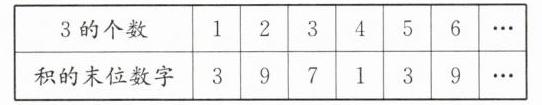 从表中可以发现,积的末位数字是按“3、9、7、1”这4个数字为一组重复出现的,一共有37÷4=9(组)……1(个),余数是1,因此积的末位数字是3。