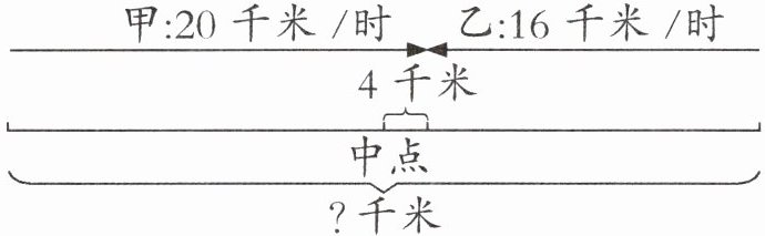 例2 甲、乙两人同时从两地骑自行车相向而行,甲每小时骑行 20 千米,乙每小时骑行 16 千米,两人相遇时距离中点 4 千米,全程长多少千米?