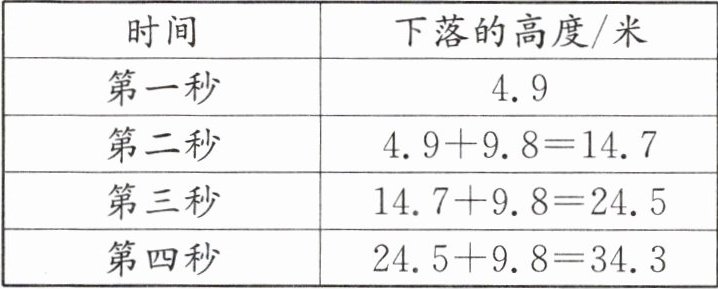 一个物体从高空下落,经过4秒落地。已知第一秒下落4.9米,以后每一秒都比前一秒多下落9.8米。这个物体在下落前距地面多少米?(先列表,再解答)