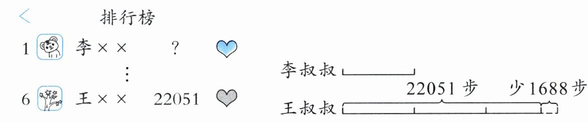 )。答案:4. 李叔叔的微信步数×3 - 1688 = 王叔叔的微信步数 $ 3x - 1688 = 22051 $