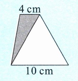 答案:思路分析:图中两个三角形的高相等,所以比较两个三角形的面积,只要比较相应的底就可以了。灰色三角形的底是4cm,白色三角形的底是10cm,求灰色三角形面积是白色三角形面积的几分之几,直接列式计算:$4÷10=\frac{2}{5}$。因为灰色三角形面积是白色三角形面积的$\frac{2}{5}$,所以可以把灰色三角形面积看作2份,白色三角形面积看作5份,那么梯形面积是7份,从而可以求出梯形面积是白色三角形面积的几分之几。