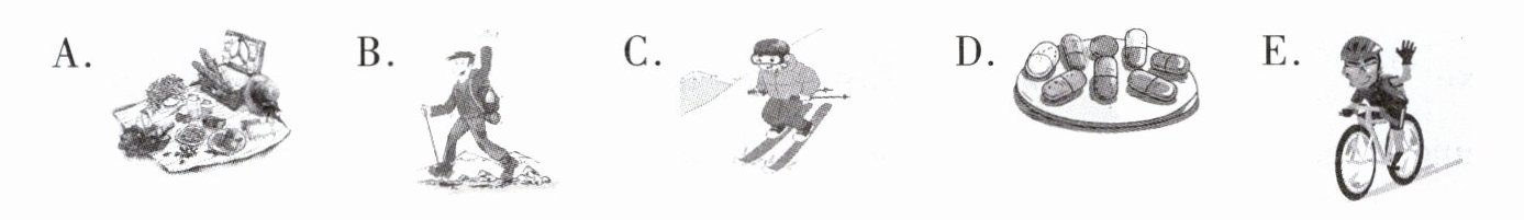 2. 题目要求匹配“骑自行车旅行的活动”,对应图片E(骑自行车)。