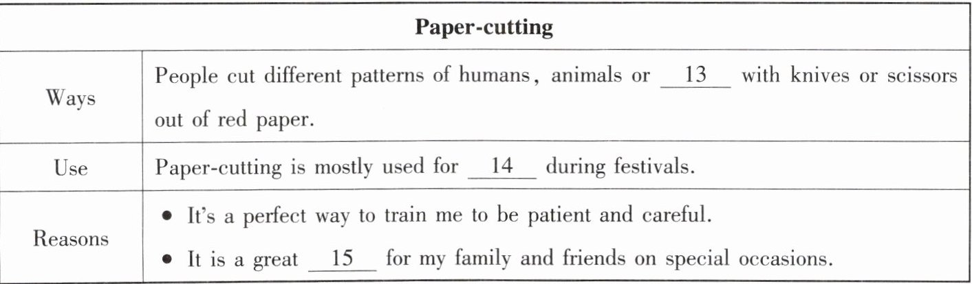 第13题:根据题中对剪纸的描述,剪纸通常是用剪刀或小刀在红纸上剪出人、动物或植物的图案,因此选择“plants”最符合剪纸的常见主题。