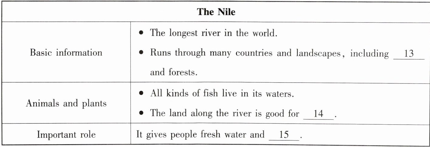 13. 根据短文“runs through many countries and landscapes, including deserts and forests”,选C。14. 由“the land along the river is good for farming”,选A。15. 依据“gives people fresh water and healthy food”,选B。