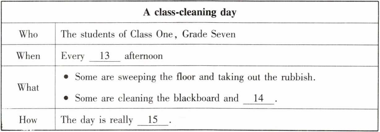 根据听力短文内容,13题提到每周三下午进行班级清洁,选C;14题中除擦黑板外,还提到擦窗户,选C;15题描述清洁日是有意义的,选A。