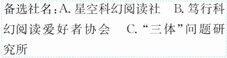 备选社名:A. 星空科幻阅读社 B. 笃行科幻阅读爱好者协会 C. “三体”问题研究所