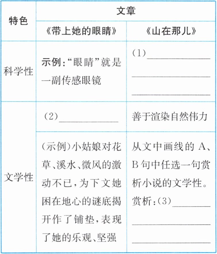 4. 【推荐指南·艺术特色】理解人物,需关注作品的艺术特色。请根据你的阅读体验,结合小说中的相关内容,完成下面表格。(6 分)