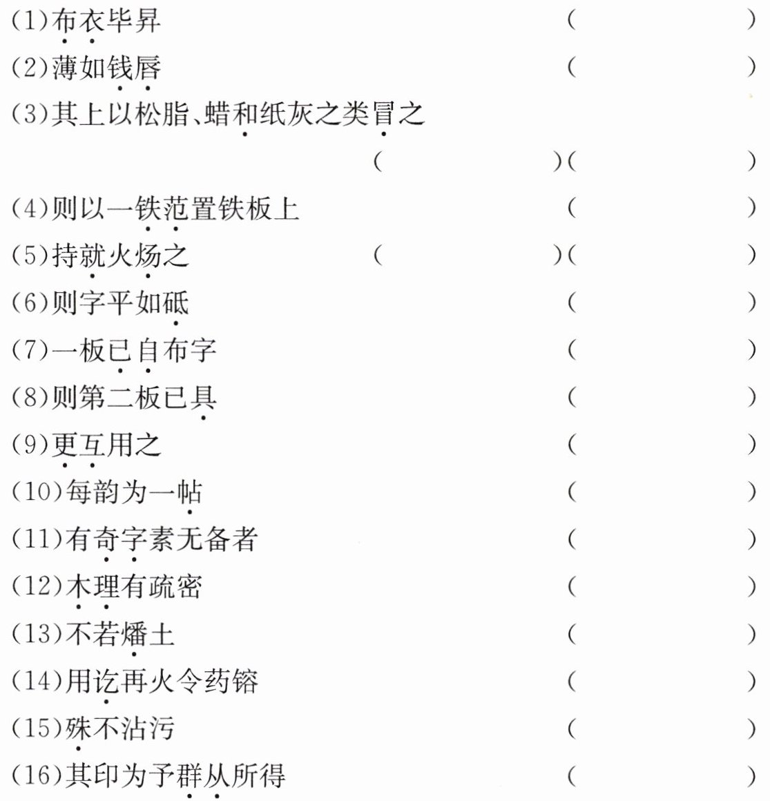 答案:(1)平民;(2)边缘;(3)混合 覆盖 ;(4)铁制的模子;(5)拿 烘烤;(6)磨刀石;(7)另外;(8)准备好;(9)交替;(10)标签;(11)生僻字;(12)木头的纹理 ;(13)烧过的黏土;(14)完毕;(15)根本;(16)堂兄弟及诸子侄