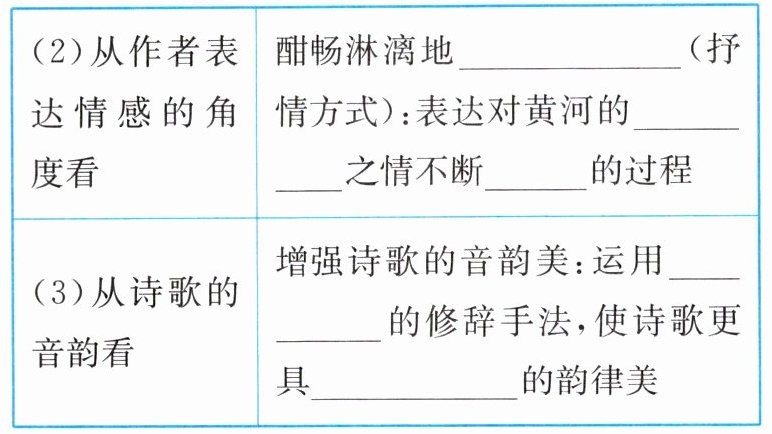 答案:3. (1) 颂黄河 (2) 直抒胸臆 赞美 加深 (3) 反复 回环往复