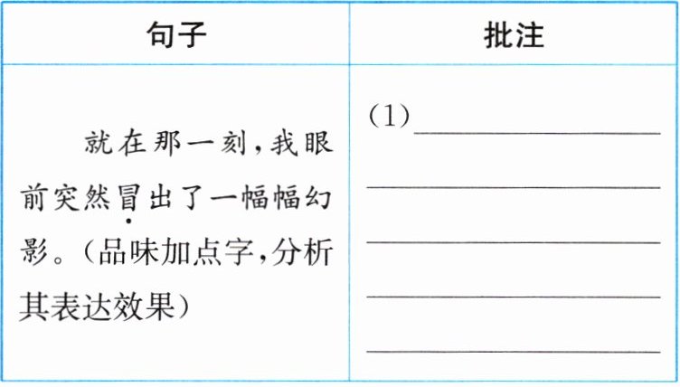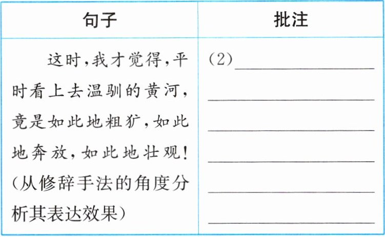 6. (1) 动词“冒”是“向外透出来、露出来”之意。它生动形象地写出了幻影出现时的动感,富有诗意。 (2) 运用排比的修辞手法,增强表达的气势,从多角度、多层面,全方位地表现黄河雄伟壮观的特点。