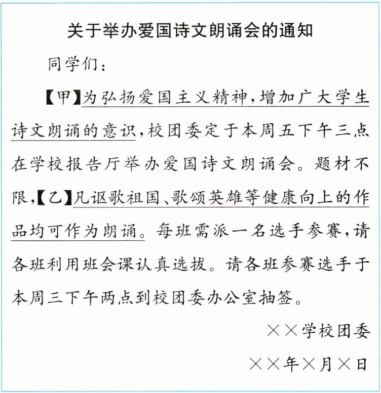 【甲】为弘扬爱国主义精神,增加广大学生诗文朗诵的意识,校团委定于本周五下午三点在学校报告厅举办爱国诗文朗诵会。题材不限,【乙】凡讴歌祖国、歌颂英雄等健康向上的作品均可作为朗诵。每班需派一名选手参赛,请各班利用班会课认真选拔。请各班参赛选手于本周三下午两点到校团委办公室抽签。