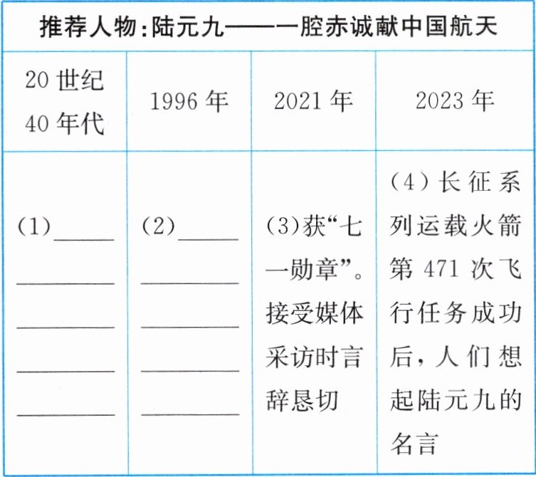 答案:3. (1)陆元九远渡重洋留学,学成归国后为我国惯性技术等方面的发展作出了卓越贡献 (2)火箭发射失败时,高龄的他日夜钻研,找到了问题的关键