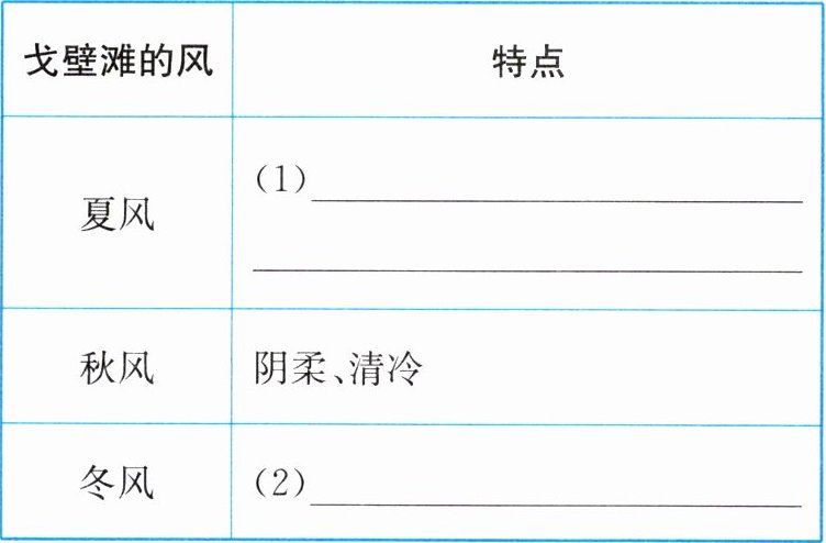 4. 文中戈壁滩的风与众不同,不同季节各有特点。小语同学制作了这张表格,请你帮助记录感受到的风的特点。(4 分)