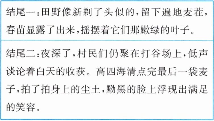 9. (示例一)我选结尾一,因为它意蕴丰富:“麦子被收割”象征着兵民们在这场麦收斗争中取得了胜利,保住了劳动成果。春苗的生长则象征着新的希望。这段文字既赞美兵民的勤劳勇敢,又传达出对胜利的坚定信念。 (示例二)我选结尾二,因为它真实可感:通过描绘一个具体的生活场景,让读者能够真切地感受到村民们麦收后的状态,生动地展现了村民们在辛勤劳作后收获成果的喜悦和自豪,增强了故事的真实感和生活气息,使读者更容易产生共鸣。
