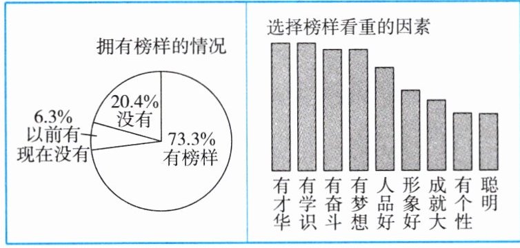 4. 小梦为大家展示了“榜样的力量”调查报告中的两个统计图,请你简要分析两图的主要信息和追随榜样的原因(不得出现数字)。