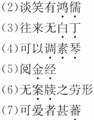 )答案:2. (1)这 能散布很远的香气,这里指德行美好 (2)大儒,指博学的人 (3)平民,指没有功名的人 (4)调弄,弹奏 不加装饰的琴 (5)指佛经(佛经用泥金书写) (6)指官府文书 (7)多 (8)只 (9)人称代词,我 沾染(污秽) (10)洗 水波 艳丽 (11)更加 (12)亲近而不庄重