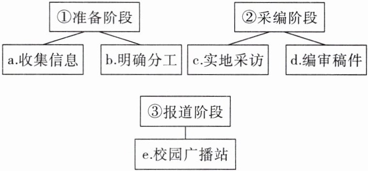答案:1. (1) (示例)本次采访活动分为三个阶段。在准备阶段,需要收集采访对象信息、明确小组分工;在采编阶段,先进行实地采访,再编审稿件;最后通过校园广播站进行报道宣传。