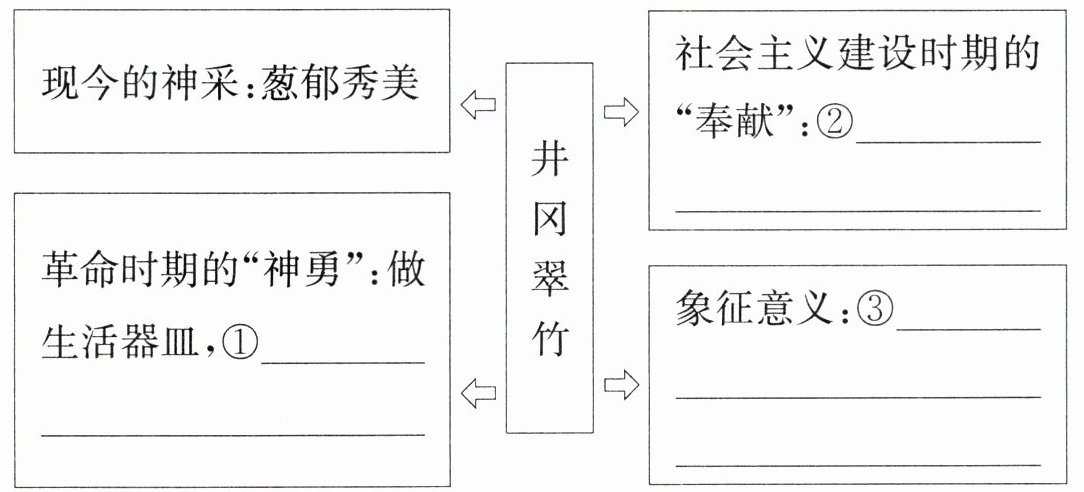 答案:2. ①长得葱翠茂密,挺拔秀美,别有一番神采;②是革命的竹子,在中国革命的各个时期发挥着重要作用,做出的不朽功绩让人难忘;③象征井冈山人民,象征中国人民的革命气节和革命精神。