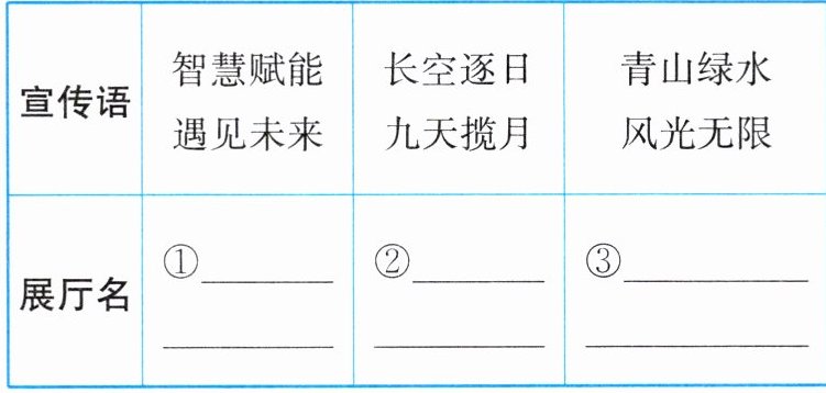 (1)在科技馆里,同学们参观了航空航天厅、低碳新能源厅和人工智能厅。小语同学为三个展厅各写了一则宣传语(见下表),请你在表中填写与宣传语对应的展厅名。