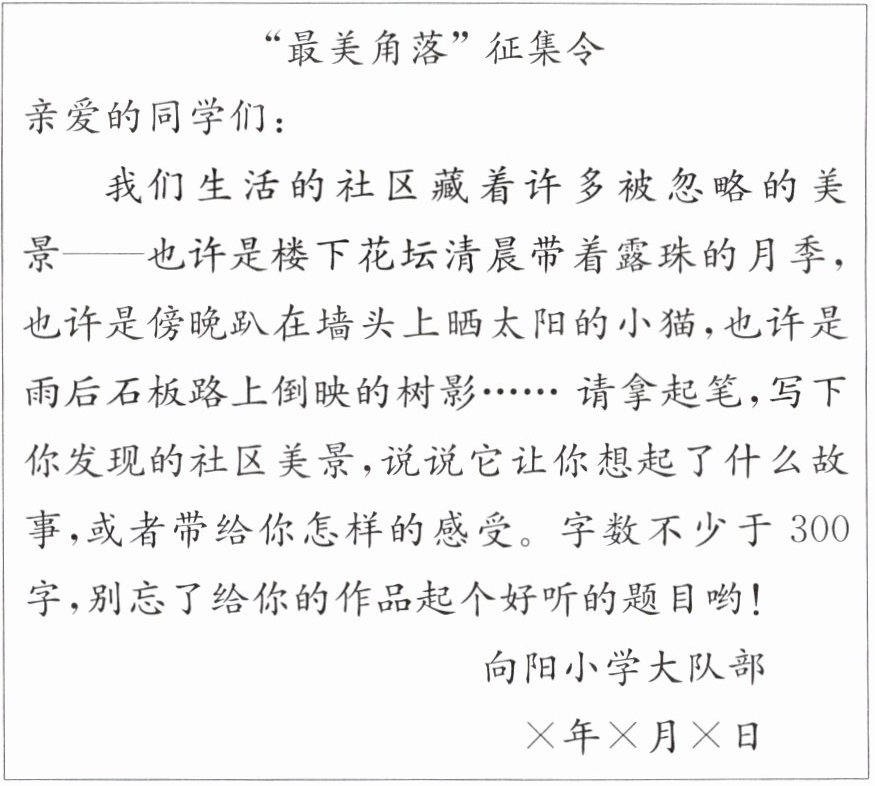请你根据征集令的要求,完成一篇习作,让更多人看到身边的美好。(请另附纸)