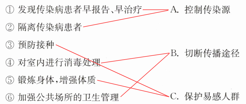 2. 切断传播途径是切断病原体从传染源到易感人群的传播路径,④对室内进行消毒处理、⑥加强公共场所的卫生管理属于切断传播途径(对应B);