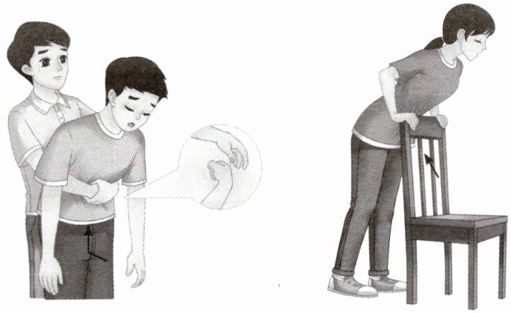 海姆立克急救法是一种解除气管异物堵塞的急救方法。常用的操作方法是救助者的双臂环绕被救者的腹部,一只手握拳,另一只手抓住拳头,用力向上冲击被救者的腹部,重复数次,直到异物被冲出。当没有他人在场时,可以利用身边的物体进行自救。自救的方法是稍稍弯下腰,上腹部靠在一个固定的硬质物体上,以物体边缘压迫腹部,快速向上冲击,重复数次,直到异物被冲出。海姆立克急救法虽卓有成效,但也有可能导致腹部或胸腔内脏破裂等。所以非必要时,不要随意采用此方法。
