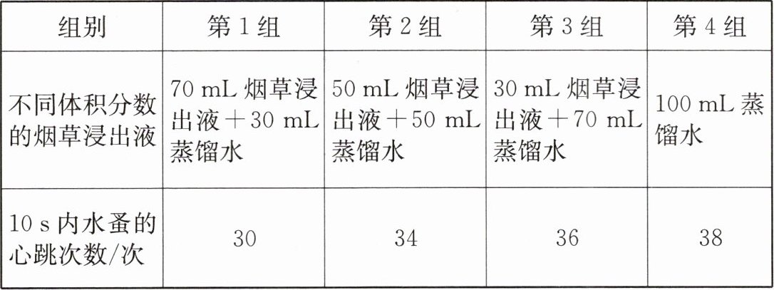 B. 由表格数据可知,烟草浸出液体积分数越高,水蚤10s内心跳次数越少,即水蚤的心率随烟草浸出液的体积分数升高而降低,B错误;