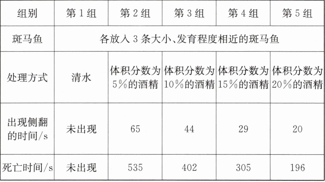 5. 第(5)问:分析表格数据可知,随着酒精体积分数升高,斑马鱼出现侧翻的时间和死亡时间均逐渐缩短,由此可推导酒精对斑马鱼生命活动的影响规律。