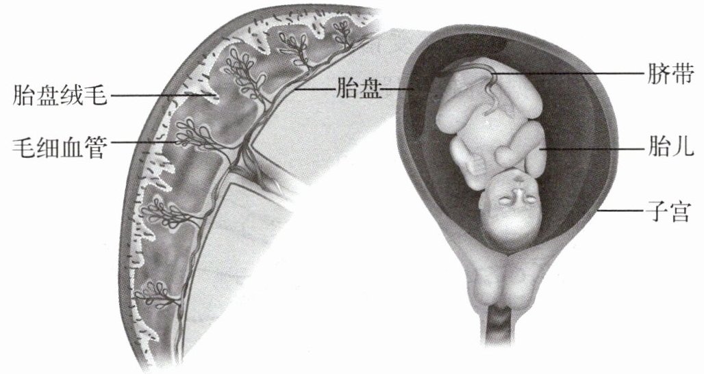 如下图所示,胎盘靠近胎儿的一侧附有脐带,脐带与胎儿相连;胎盘靠近母体的一侧与母体的子宫内膜相连。胎儿通过胎盘与母体进行物质交换。胎儿体内的营养物质和氧都是通过母体获得的,胎儿产生的废物也是通过母体排出的,所以在怀孕期间,母亲身体的负担明显加重,精神负担也会加重。