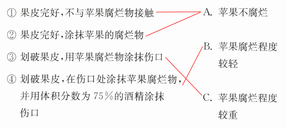 ③划破果皮后用腐烂物涂抹伤口,微生物可通过伤口侵入苹果大量繁殖,苹果腐烂程度较重,对应C;