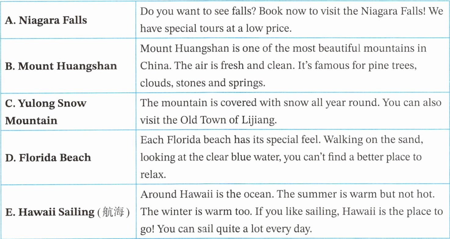 二、信息匹配,为题干中的每个人选择一个合适的旅游去处
