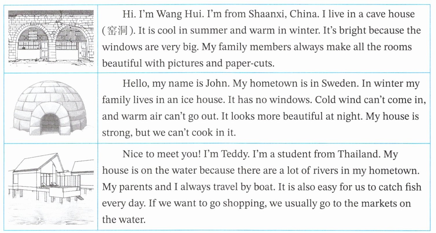答案:1. Because the windows are very big. 2. In winter. 3. Because there are a lot of rivers in his hometown. 4. They go to the markets on the water. 5. The cave house. Because it is cool in summer and warm in winter.(言之有理即可)