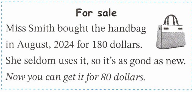 Miss Smith bought the handbag in August, 2024 for 180 dollars. She seldom uses it, so it's as good as new. Now you can get it for 80 dollars.