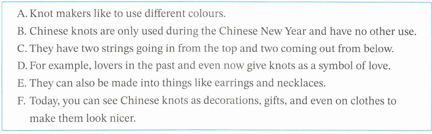 F. Today, you can see Chinese knots as decorations, gifts, and even on clothes to make them look nicer.