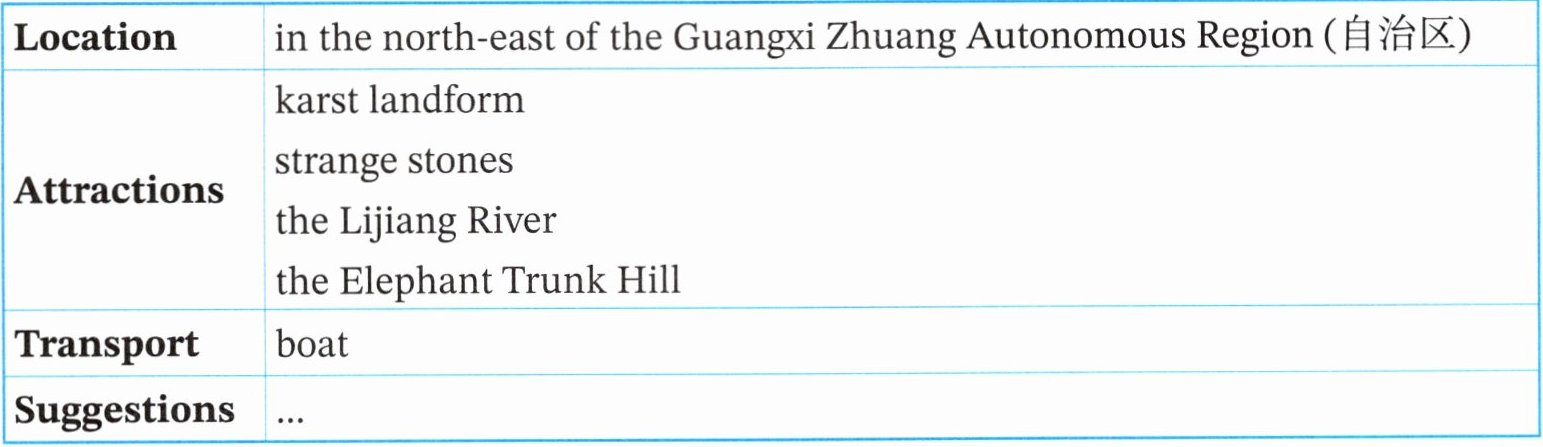 Guilin is in the north-east of the Guangxi Zhuang Autonomous Region. It is a great place to enjoy beautiful scenery. There you can see karst landform. The strange stones are one of the most famous attractions there. What's more, you can take a boat to enjoy the beautiful Lijiang River. You can also go to the Elephant Trunk Hill. It looks like a huge elephant drinking water by the river with its trunk.