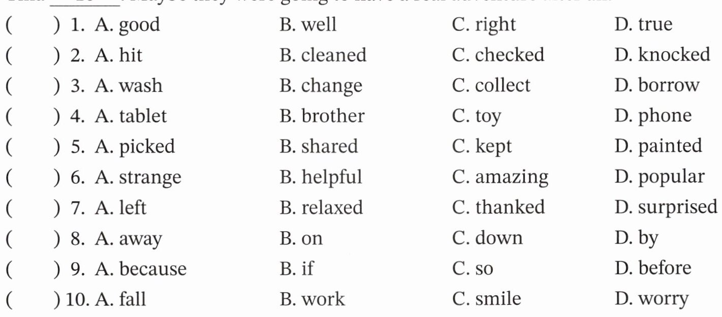 Tina was going on a road trip with her family. At first, everything went on very 1. But unluckily, their car stopped working. Dad got off and 2 the car. Then he said, “You stay in the car. I have to 3 the tire (轮胎). We’ll go on our adventure (冒险) soon!”