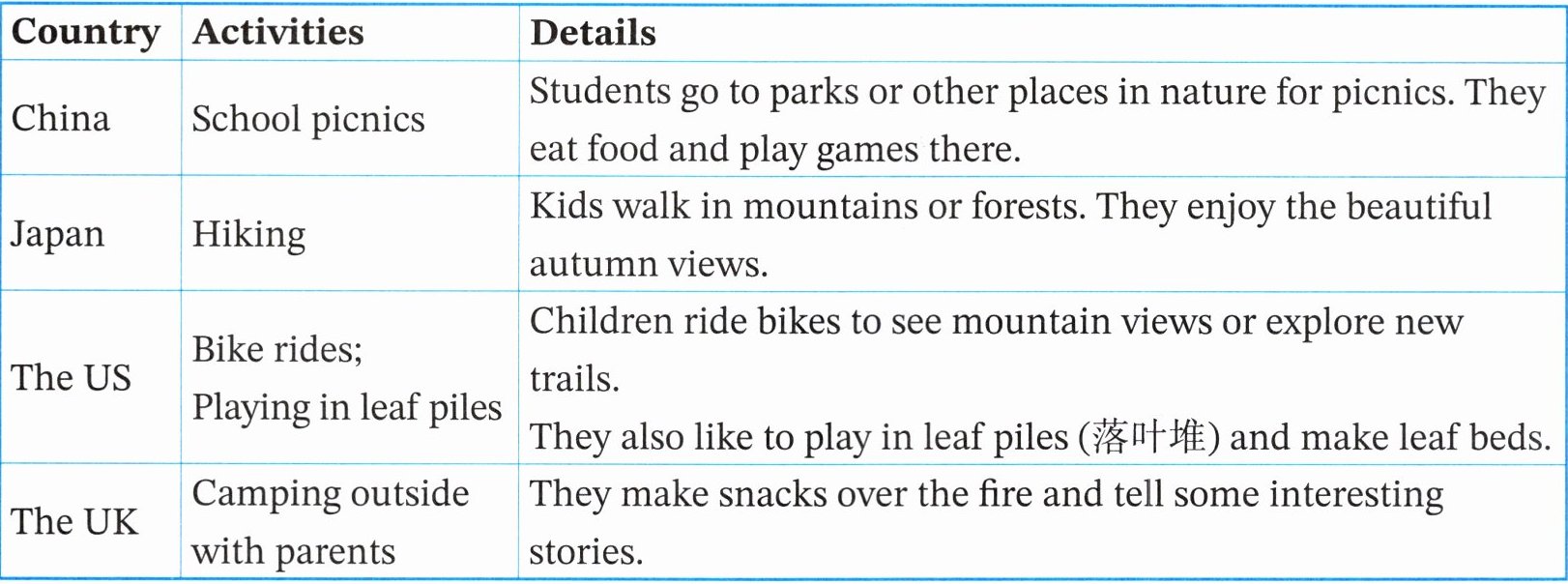 () 3. In which country do kids enjoy walking in mountains or forests in autumn?