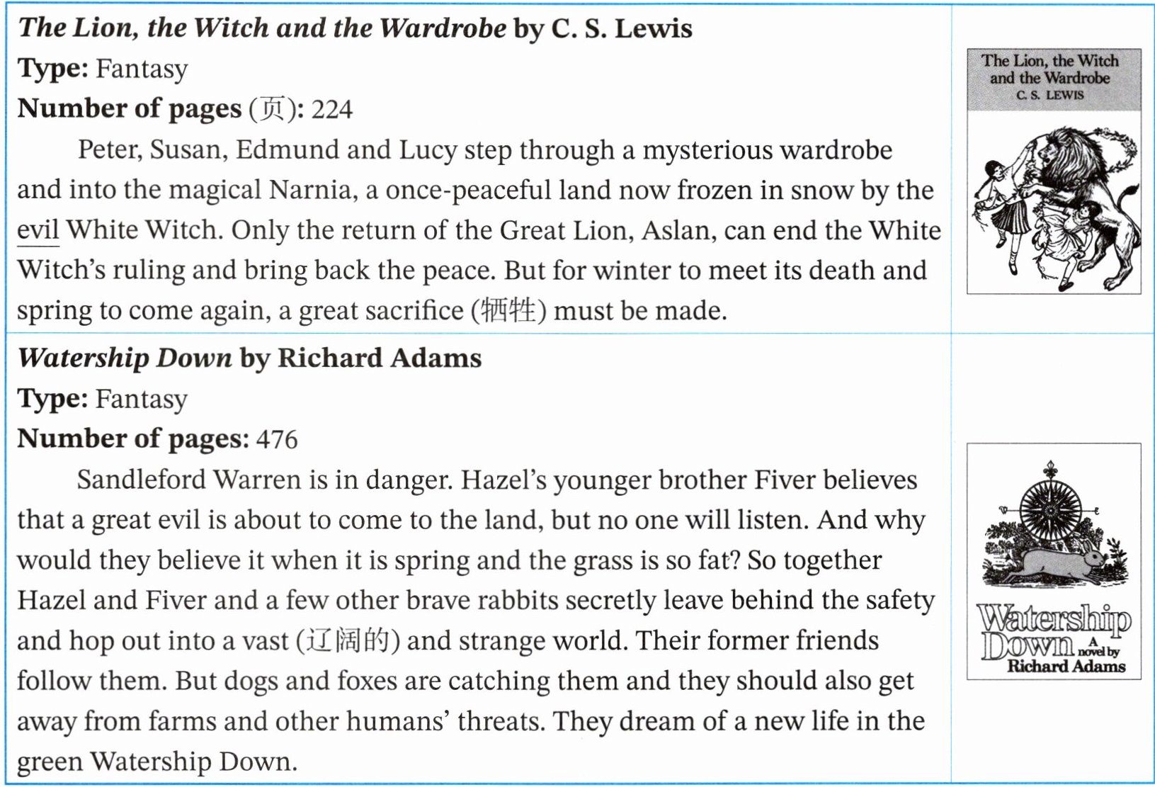 1. 细节理解题。查看两本书的信息,《The Lion, the Witch and the Wardrobe》和《Watership Down》的Type(类型)均为Fantasy,因此它们在类型上有共同点,故选D。